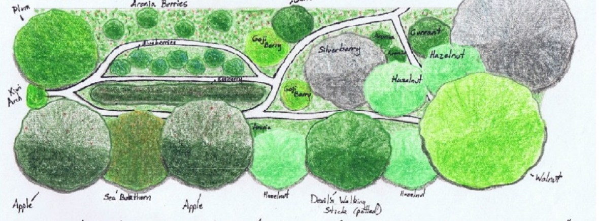 “Enter Food Forest through Kiwi archway, shade covered pathway meanders past familiar and new varieties. Eventually becomes dense canopy with possibility for quiet space with bench. Pathways connect with main garden but are limited: saving space, maintaining mystical feeling, and limiting entry for deer. Productive bushes, such as Blueberry and Raspberry have their own paths for accessibility.